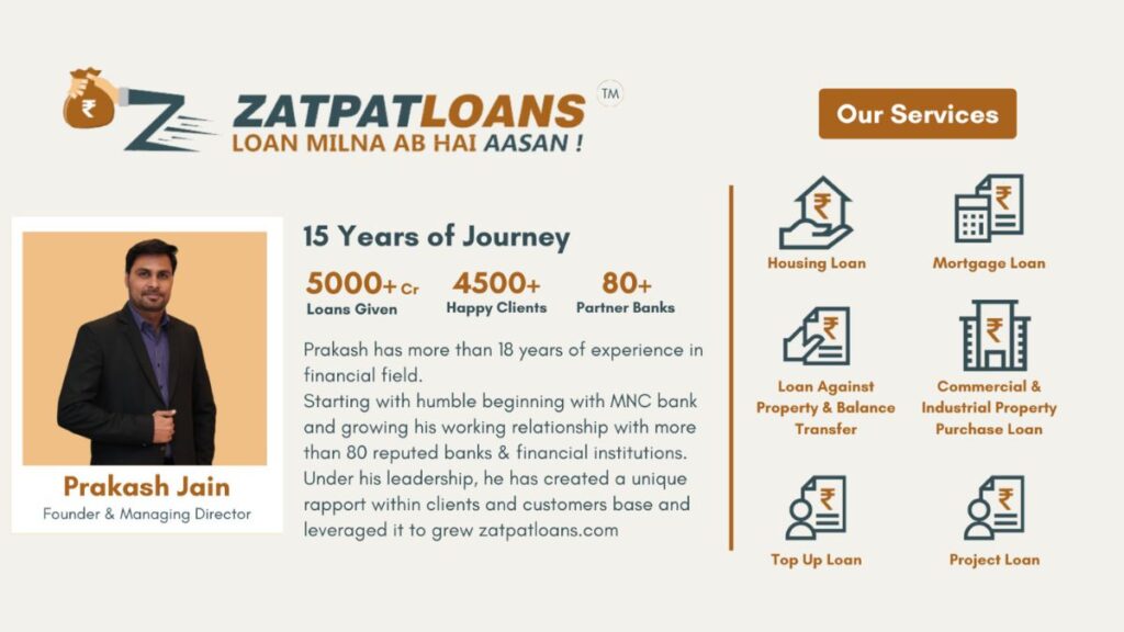 ZATPAT LOANS एक फाइनेंसियल संस्था है जिसे मिस्टर प्रकाश जैन ने बनाया है और इसका मुख्य उद्देश्य हाउसिंग लोन, मोर्टगेज लोन, बिजनेस लोन, पर्स्नल लोन को व्यक्तियों और व्यापारों को प्रदान करना है। मिस्टर प्रकाश जैन के 17 साल के फाइनेंसियल संबंधी अनुभव के साथ, इसने अपने नेतृत्व में ग्राहकों और उपभोक्ताओं के साथ एक विशेष संबंध बनाया है और इसे बढ़ाने के लिए उपयोग किया है।